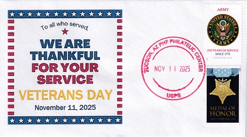| This cacheted cover salutes Veterans Day 2025. Hand cancellation: "PHF PHILATELIC CENTER, TUCSON, AZ USPS NOV 11 2025". |