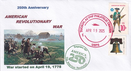 | This cacheted cover commemorates the 250th anniversary of the American Revolutionary War and the first day of the war on April 19, 1775. Hand cancellation: "PHF PHILATELIC CENTER, TUCSON, AZ USPS APR 19 2025". |