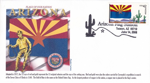 | These cacheted covers feature flags of some U. S. states. Special hand pictorial cancellations: "Arizona Flag Station, Tucson, AZ 85719 June 14, 2008". [TPS] |