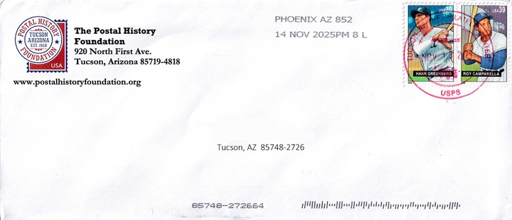 | Hand cancellation: "PHF PHILATELIC CENTER, TUCSON, AZ USPS NOV 13 2025". |