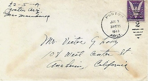 ![]() | Hand cancellation: "POSTON, ARIZ. JUN 7 1943 | 2 |". |