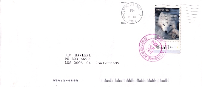 | Hand cancellation on back: "AVONDALE, AZ USPS AUG 27 1993". |