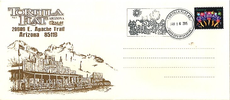 | This cacheted cover features Tortilla Flat. Hand pictorial cancellation: "TORTILLA FLAT CPU #134, AZ 85119 USPS JAN 26 2015". |