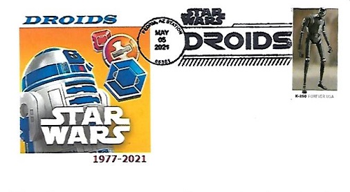 | Special hand slogan cancellation: "SUN CITY WEST, AZ STATION 85375 MAY 5 2021 | STAR WARS DROIDS |". |