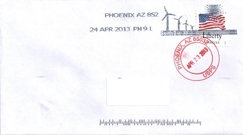![]() | Hand cancellation: "PHOENIX, AZ 85032 USPS APR 23 2013". |