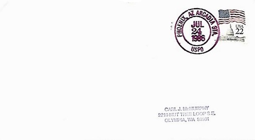 ![]() | Hand cancellation: "ARCADIA STA., PHOENIX, AZ USPO JUL 24 1986". |