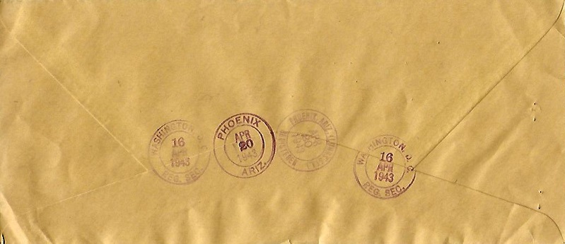 | Hand cancellation on back: "REGISTERED, (LUHRS STA.), PHOENIX, ARIZ. APR 20 1943". Has "Return Receipt Demanded. Return after 30 days, if unclaimed" auxiliary marking on front. |