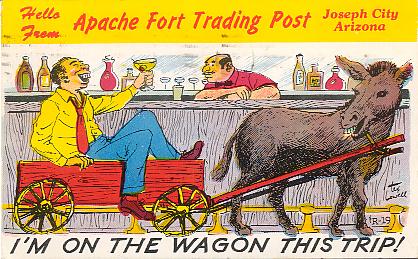 | "Hello from Apache Fort Trading Post, Joseph City, Arizona. ...". Color chrome-style printed postcard. Published by Baxtone, Amarillo, Texas. Number R19. Postmarked 1963. |