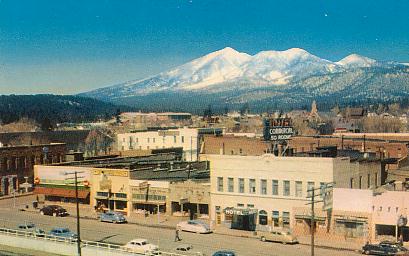 | "Welcome to Flagstaff, Arizona. Elevation 6895". Color chrome-style printed postcard. Published by Bob Petley, Phoenix, Arizona. Number K267A. Unused. Circa 1950s. |
