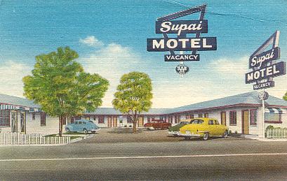 | "Supai Motel. Seligman, Arizona. ...In center of city on Highway 66. ...". Color linen-texture printed postcard. Published by Lynx Products, Salt Lake City, Utah. Number 18,233F. Postmarked 1958. |