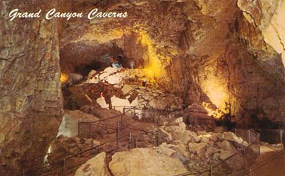 | "Dinosaur Caverns. ...on Route 66 west of Seligman, Arizona, ...". Color chrome-style printed postcard. Published by Petley Studios, Phoenix, Arizona. Number C13301. Postmarked 1965. |