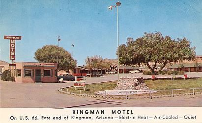 | "Kingman Motel. On U. S. 66, east end of Kingman, Arizona. ...". Color chrome-style printed postcard. Published by Colourpicture, Boston, Mass. Number P15425. Unused. Circa 1950s. |