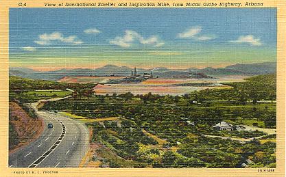 | "Miami, Arizona. Showing copper mining operations". Color chrome-style printed postcard. Published by Petley Studios, Phoenix, Arizona. Number 39944. Postmarked 1962. |
