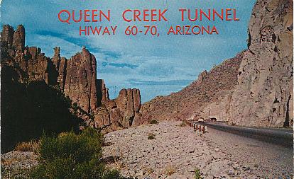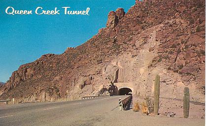 | "Entrance to the million dollar Queen Creek Tunnel, Hiway 60-70...". Color chrome-style printed postcard. Published by Petley Studios, Phoenix, Arizona. Number P38249. Unused. Circa early 1960s. |