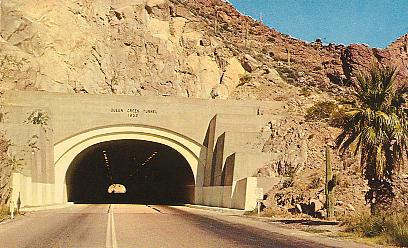 | "Claypool Tunnel. U. S. Highway 70 between Miami and Superior, Arizona". Real Photo postcard. Published by Frashers Fotos, Pomona, Calif. Number X319. Unused. Circa 1940s. |