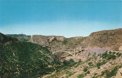 | "Pinto Creek Bridge. Globe-Superior Hy., Globe, Arizona". Real photo postcard. Publisher not given. Number S-48. Unused. Circa 1940s. |
