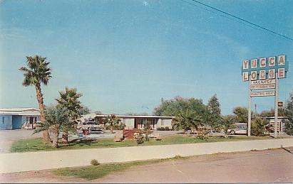 | "Yucca Lodge. East side of Gila Bend, Arizona. On U. S. Highway 80". Color chrome-style printed postcard. Published by R. Meline, Minneapolis, Minn. Number 19533-B. Unused. Circa late 1950s. |