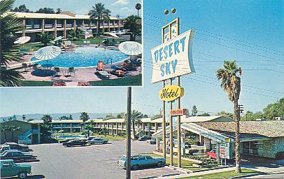 | "The Desert Sky Hotel. 3541 E. Van Buren, Phoenix, Arizona, on U.S. Highway 60-70-80-89". Color chrome-style printed postcard. Published by Petley Studios, Phoenix, Arizona. Number 90303. Unused. Circa early 1960s.