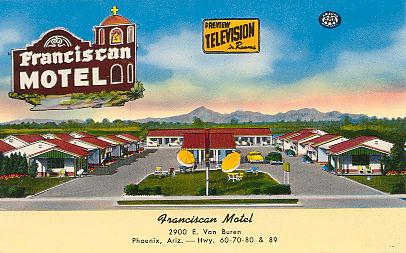 | "Franciscan Motel. 2900 E. Van Buren, Phoenix, Arizona. Hwy. 60-70-80 & 89". Color chrome-style printed postcard. Published by Colourpicture, Boston, Mass. Number SK6994. Unused. Circa 1950s. |