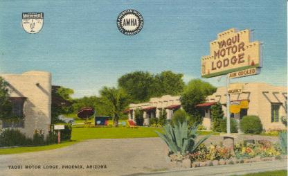 | "Arizona Motel. Phoenix, Arizona. East on Highways 60-70-80-89". Color linen-texture printed postcard. Published by MWM, Aurora, Mo. Number K2291. Postmarked 1950. [This is at 2625 East Van Buren]. |