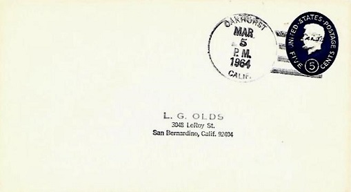 | Hand cancellation: "OAKHURST, CALIF. MAR 5 1964". |