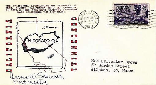| Hand cancellation: "MARIPOSA, CALIF. MAR 1 1950 | 1 |". |