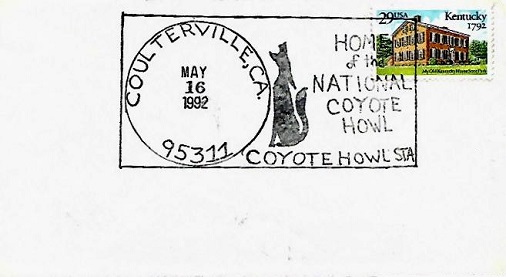 | Special hand pictorial & slogan cancellation: "COYOTE HOWL STA., COULTERVILLE, CA. 95311 MAY 16 1992 | HOME of the NATIONAL COYOTE HOWL |". |