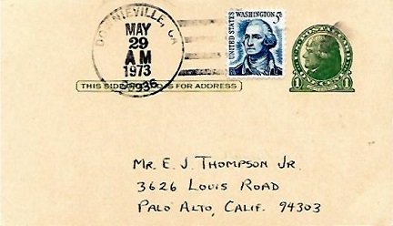 | Hand cancellation: "DOWNIEVILLE, CA 95936 MAY 29 1973". |