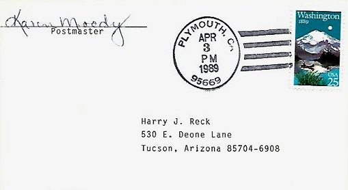 The postmarks in this exhibit are on postally used envelopes and postcards and date from 1934, the year the route was created and signed, to the present. They are listed in travel order along California Highway 49 from its south terminus to its north end.