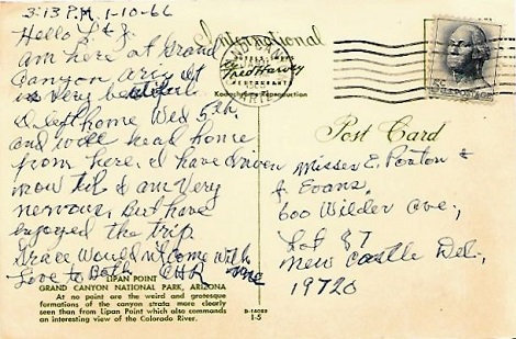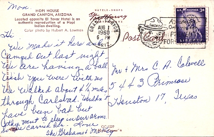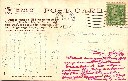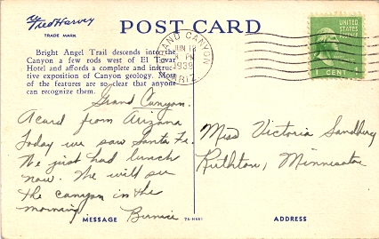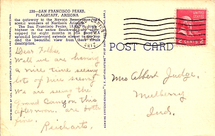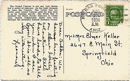 Hand cancellation: "NORTH RIM, ARIZ. JUN 7 1948". [This was sent by my aunt to my grandparents!]