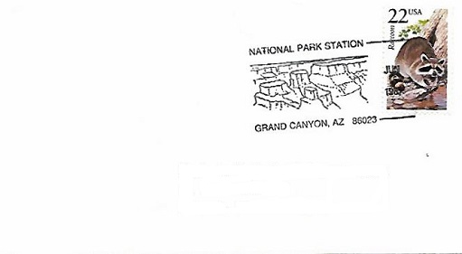 Here are postal cancellations from post offices in Grand Canyon National Park in northern Arizona. The cancellations are mostly on vintage tourist postcards supplemented with some postally used envelopes and philatelic covers. Currently there are two active post offices within the park. The "Grand Canyon Post Office" (est. 1902) is on the south rim, and the "North Rim Post Office" is located on the north rim of the park. The North Rim PO was originally named "Kaibab Forest Post Office" (est. 1926) and was renamed "North Rim Post Office" in 1947. There were three other earlier post offices on the south rim that were later discontinued. The first post office in the park was called "Tolfree" (est. 1894, discont. 1896) in operation for less than two years. Another discontinued post office was "Tourist" (est. 1897, discont. 1899) and it existed for only two years. The other post office was the "Grandview Post Office" (est. 1903, discont. 1908) associated with the pioneer Grandview Hotel, one of the early tourist destinations on Grand Canyon's south rim.