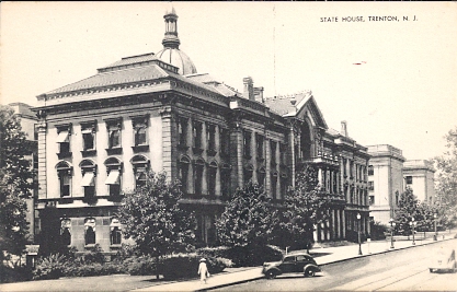 | "State House, Trenton, N. J.". Black & white printed postcard. Published by the Mayrose Co., Linden, N. J. Unused. Probably circa 1930s. |