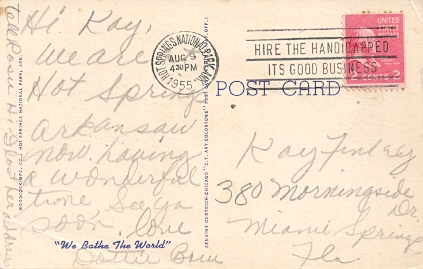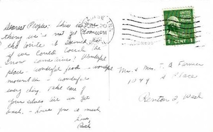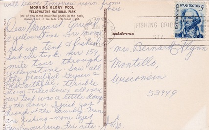 | Machine cancellation: "| FISHING BRIDGE STA. | YELLOWSTONE NATIONAL PARK, WYO. AUG 15 1963". |