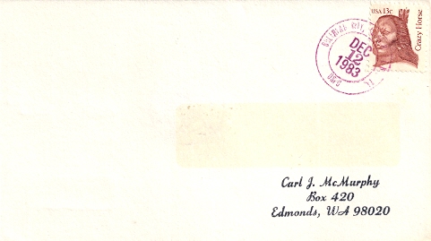 | Special hand pictorial & slogan cancellation: "WORLD RECORD WIND 50TH ANNIVERSARY STA., MOUNT WASHINGTON, NH 03589 APRIL 12 1984 | 231 MILES AN HOUR |". |