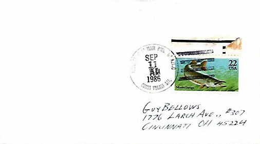 | Hand cancellation: "GRANT VILLAGE STA., YELLOWSTONE NATIONAL PARK, WY 82190 SEP 11 1986". |