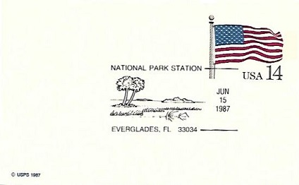 | Special hand pictorial cancellations: "NATIONAL PARK STATION, YELLOWSTONE, WY 82190 JUN 15 1987". |
