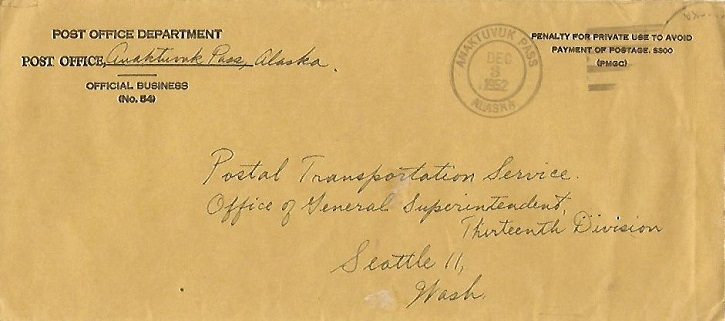 | Hand cancellation: "COAL CREEK, ALASKA DEC 12 1936". |