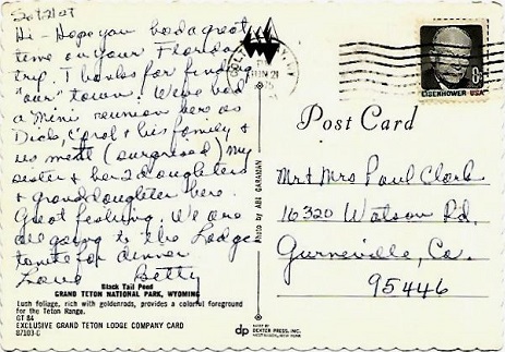 | Machine cancellation: "| FISHING BRIDGE STA. | YELLOWSTONE PARK, WYO. AUG 20 1962". |