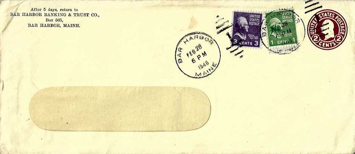 | Hand cancellation: "BAR HARBOR, MAINE FEB 28 1946 | 1 |". |