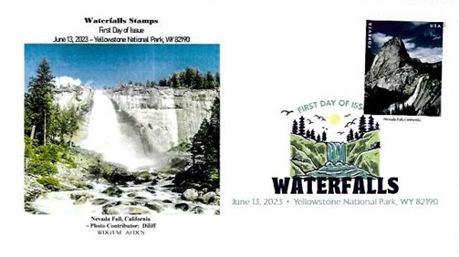 | Special digital color pictorial & slogan cancellation: "Yellowstone National Park, WY 82190 June 13, 2023 | FIRST DAY OF ISSUE WATERFALLS |". |