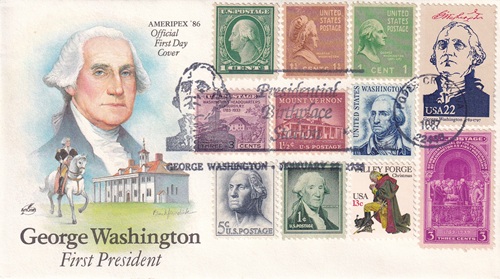 | Special hand pictorial & slogan cancellations: "Presidential Birthplace Station, QUINCY, MA 02169 OCT 30 1986 | JOHN ADAMS - OCTOBER 30, 1735 |". |
