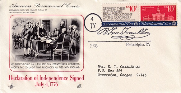 | Special hand commemorative cancellation: "ARKANSAS POST, AR 72055 JULY 4 1976 | 1776 - 1976 |". |