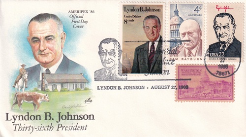 | Special hand pictorial & slogan cancellations: "Presidential Birthplace Station, QUINCY, MA 02169 JULY 11 1986 | JOHN QUINCY ADAMS - JULY 11, 1767 |". |