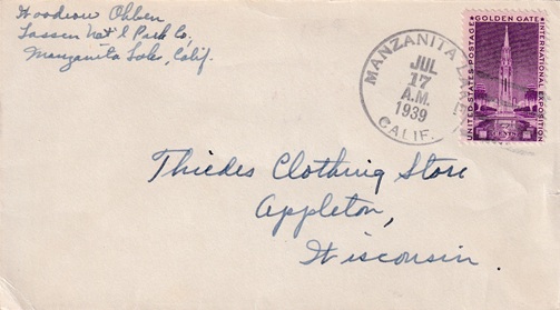 | Machine cancellation: "| FISHING BRIDGE STATION | YELLOWSTONE PARK, WYO. JUL 9 1939". |
