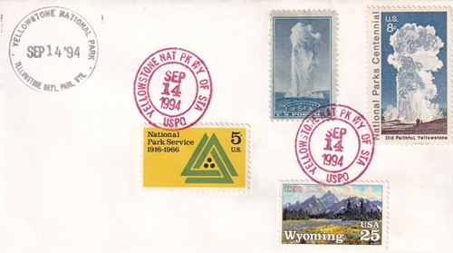 | Hand cancellation: "OF STA., YELLOWSTONE NAT PK, WY USPO SEP 14 1994". |
