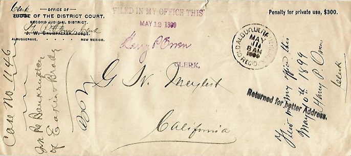 | Hand cancellation: "REC'D., OLD ALBUQUERQUE, N.MEX MAY 11 1899". Has "Returned for better Address" auxiliary marking. [TPC] |