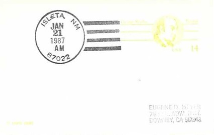 | Hand cancellation on front & back: "ISLETA, NM 87022 JAN 21 1987". |