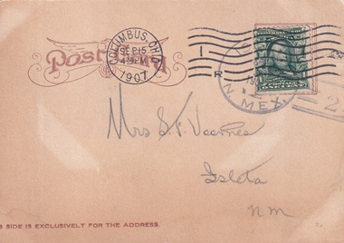 | Doane hand cancellation: "ISLETA, N. MEX. SEP 19 1907 | 2 |". |