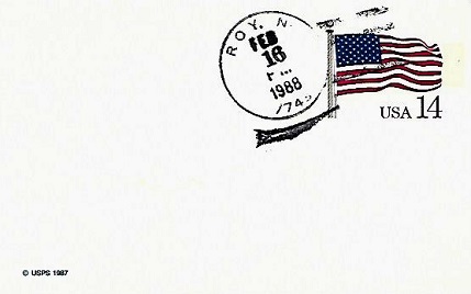 | Hand cancellation: "ROY, NM 87743 FEB 16 1988". |