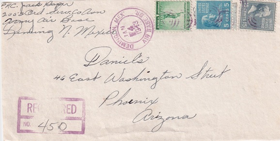 | Hand cancellation: "AIR BASE BR., DEMING, N. MEX. JAN 4 1943". Has "REGISTERED NO." auxiliary marking. |